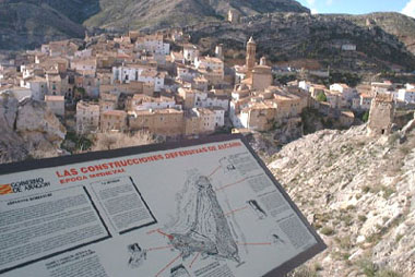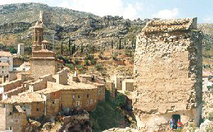 Así, pueden indentificarse ocho torreones en el pueblo situados en los lugares más altos del mismo y dominando el horizonte. Otras tres torres más conforman el total de las que pueden reconocerse, pero éstas están anexas a un castillo triangular. De esta forma, recorriendo la "Cuesta de los Royales" nos encontramos con cuatro torres: dominando las vertientes del río Radón observamos una en buen estado de conservación: "el Palomar de la Solana", más allá "el Torreón de San Ramón" del que sólo puede apreciarse su planta,"el Torreón de los Moros" que es el que mejor se conserva, con paredes de casi un metro de espesor y tres pisos y "el Torreón de las moras", muy representativo de la época árabe pero derruido. Junto a estos: "el Palomar de la Solana" y "el Torreón del Puntal" más otros restos de supuestas torres derruidas pero con sus plantas visibles, forman el total de las fortificaciones que guardaron a Alcaine de las intromisiones militares. En esta época hemos de mencionar también la "Cueva de los Esquiladores" que sirvió de refugio o para acumular provisiones. |